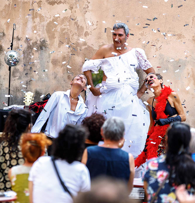 Vendredi soir, à 19h, le collectif « Membres » ouvre le bal avec un spectacle de théâtre de rue qui déconstruit les stéréotypes liés à l’apparence physique. Dans une ambiance de bistrot, propice à la confidence, à la rencontre, les comédiennes se livrent et nous livrent leurs réflexions, non sans humour…