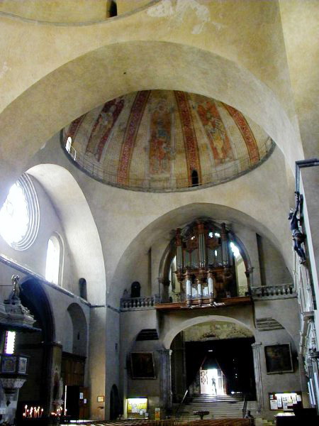 La restauration des Grandes-Orgues, commencée en 1984, a été réalisée par l’atelier du facteur d’Orgue Gérald GUILLEMIN. Au démontage de l’instrument, des fresques du XIVe siècle furent découvertes sur le mur de la façade ouest. Pour pouvoir les mettre en valeur, on a dû dégager la voûte du narthex. La profondeur de l’orgue a été réduite et un second buffet, réalisé par les Monuments Historiques, a été ajouté à l’arrière de l’instrument. Le buffet de LEPINE a été remis dans son état d’origine.