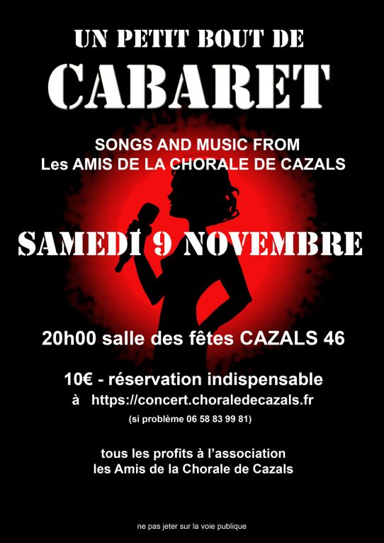 C’est le moment de réserver vos billets pour une soirée de cabaret à la Salle des Fêtes de Cazals.  Des chansons très variées, accompagnées par la musique de Margaret Griffith, Anke de Bruijn Peter Duiverman et Rudi Wouters .  Une buvette, une soirée entre amis – il ne faut pas s’en passer!  Il nous reste que 25 places.  Tout profit à l’association Les Amis de la Chorale de Cazals.