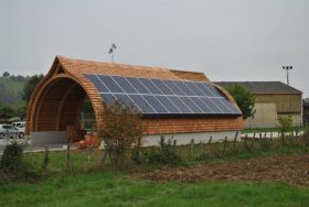 L’abri est constitué d’une charpente bois en forme de coque de bateau renversée et recouvert de panneaux photovoltaïques sur un côté. Ceux-ci permettent à l’équipement d’assurer sa propre production d’électricité, et à terme, d’équilibrer la dépense consentie. Ce préau est l’œuvre d’un partenariat entre l’association Les Amis du Bois et la coopérative Fermes de Figeac (chargée de l’installation et de l’entretien des panneaux photovoltaïques) et réalisé par les Charpentes Vincent de Caniac-du-Causse avec du bois local. Ce préau vient renforcer les aménagements de Bagnac-sur-Célé déjà réalisés en matière de transition écologique (travaux d’économie d’énergie à la Maison de santé, à l’école maternelle, gymnase équipé d’un éclairage Led®).