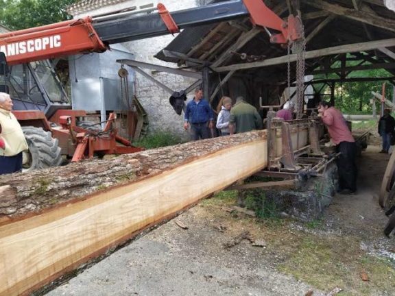Retrouver une pièce en chêne afin de remplacer la queue du moulin n’a pas été évident. Mais c’est grâce à Francis Moles et à son réseau de connaissance qu’a pu être trouvée un tronc de 13 m qui convenait. Dès réception de la pièce au moulin il ne manquait plus qu’à trouver l’équipe pour découper cette belle pièce.
