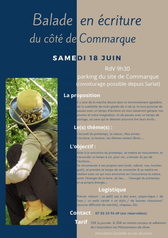 Il y aura de la marche douce dans un environnement agréable, de la cueillette de mots glanés de ci de là, le tout ponctué de pauses avec un temps d’écriture où nous laisseront galoper nos plumes et notre imagination, et de pauses avec un temps de partage, où ceux qui le désirent pourront lire leurs écrits…