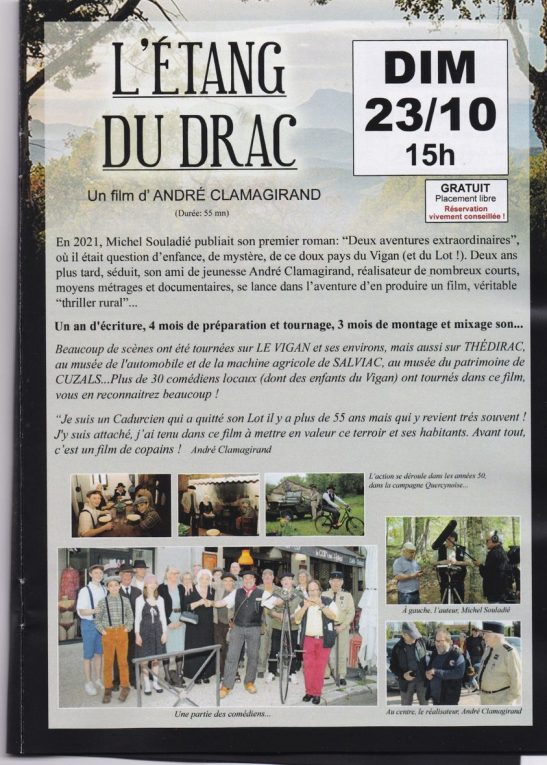 Vendredi soir, salle de spectacles du Vigan Frédéric DEGAT a brillamment présenté les spectacles à venir dans la salle Jean Carmet. Le programme est éclectique entre pièces de théâtre avec des noms connus (Baudracco family pour Manon des Sources, Thierry Beccaro, Didier Gustin etc… Et de la musique à gogo dans des genres très variés. Y figure en bonne place le film « l’Etang du Drac » tourné au Vigan et dans notre département qui met en valeur quelques magnifiques paysages mais aussi l’accueil et les productions locales de nos agriculteurs, artisans et commerçants. Tout le savoir faire d’André Clamagirand transpire dans sa présentation. Ce moyen métrage est tiré des nouvelles de Michel Souladié que le monde entier nous envie « deux aventures extraordinaires » chez Edilivre que l’on peut trouver au Vigan chez Spar ou à Gourdon à la librairie « Des Livres et Vous », ou pour ceux qui n’ont pas la chance d’habiter notre beau pays par internet en numérique chez Edilivre ou papier chez Amazon. Pour ceux qui souhaiteront à assister à la projection (gratuite) du film le 23/10/ à 15h, il sera plus prudent de réserver. Merci.