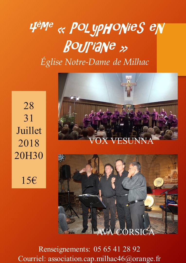 - En clôture de ces 4ème Polyphonies en Bouriane, C.A.P. Milhac recevra pour la 3ème fois, Ava Corsica, plébiscité par les spectateurs et les membres de l’association avec cette année une originalité : le concert sera précédé par un buffet « assiette de produits corses » (sur réservation uniquement) Doit-on présenter encore ces chanteurs musiciens ? Complices dans la vie, ils charment, sur scène, un public séduit dès les premières notes. Polyphonies anciennes, créations du groupe et reprise de vieux chants fascinent et réjouissent, on ne peut que succombé à cette âme corse empreinte d’émotions, de vie et d’histoire, assister à un concert vous mènera ailleurs, dans cette île qu’ils chérissent,,sûrement ! 19h, en extérieur ou à la salle des fêtes, place de la mairie, buffet – 12€ 20h30, concert en l’église Notre dame de Milhac – 15€ Venez rejoindre les spectateurs qui, chaque année, reviennent pour le plaisir de retrouver Ava Corsica !