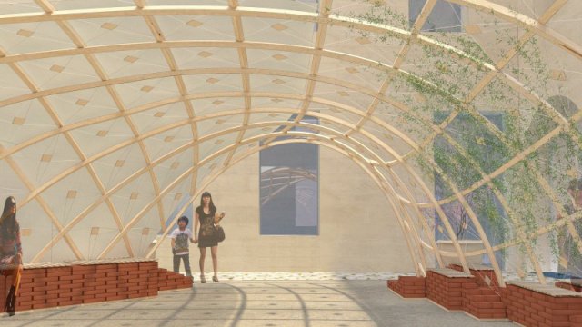 Avec le système structurel du Gridshell, le pavillon permet de franchir une portée de 9 mètres en exploitant les contraintes de courbure comme des potentiels d’usages : assises, table pour les enfants, etc.