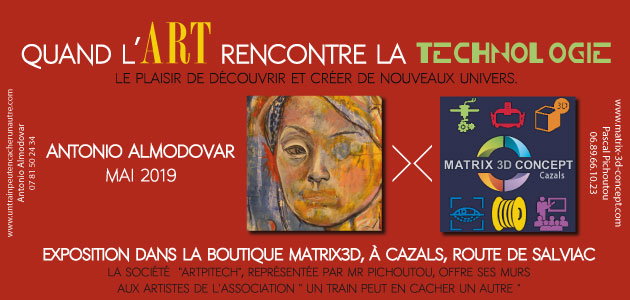 L’ artiste Antonio Almodovar (07 81 50 24 34 , en transit sur Cahors)  membre de l’association « un train peut en cacher un autre »  ouvre la saison d’expositions estivales 2019. Vous pourrez découvrir une partie de son travail via des petits formats : boutique Matrix 3D Cazals: