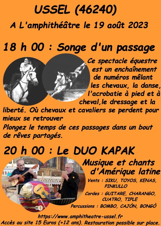 USSEL: Spectacle équestre à l’Amphithéâtre le 19 août 2023 18h00 Publié le jeudi, 3 août 2023jeudi, 3 août 2023 par MAIRIE D'USSEL