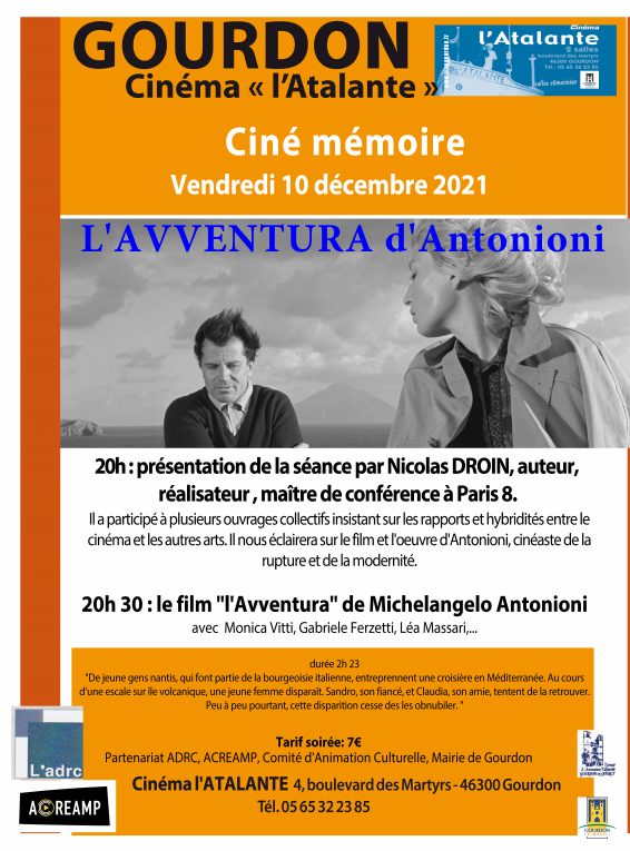 L’AVVENTURA d’Antonioni revient sur nos écrans. Réservez votre soirée du VENDREDI 10 Décembre à 20h au cinéma l’Atalante, heureux de vous le proposer dans sa version restaurée et présenté par Nicolas DROIN, maitre de conférence à Paris 8. Prix du jury à Cannes en 1960, ce film marque la modernité du cinéma d’Antonioni, dont Monica Vitti, son interprète dira « « Antonioni crée un monde poétique, un univers de raison et d’émotion, dans lequel l’acteur a la même place qu’un paysage ou un son ».