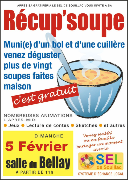 Venez partager une (récup’)soupe Publié le dimanche, 22 janvier 2023lundi, 23 janvier 2023 par Vuillemin avec l’association du SEL de Souillac. Entrée gratuite