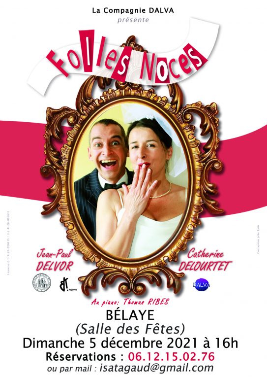 De rires en rires, l’association « Vivre à Bélaye » s’ingénie à égayer votre automne : après le succès des « Frères Brothers », elle vous propose le dimanche 5 décembre à 16h, dans la salle des fêtes de Bélaye, un spectacle divertissant et drôle : Folles Noces. Il s’agit d’une comédie musicale inclassable, en tournée depuis plus de 10 ans dans toute la France, un hommage insolent et loufoque au théâtre, au cabaret, au music-hall .Catherine et Jean-Paul vous invitent à leur mariage… Le couple enchaîne les situations cocasses en revisitant un répertoire qui va des Années Folles à aujourd’hui. Un feu d’artifice de sketches, de chansons fantaisistes et de parodies déjantées pour fêter le plus beau jour de leur vie. Comédiens et chanteurs, Catherine Delourtet et Jean-Paul Delvor sont accompagnés aux claviers et à la guitare par Thomas Ribes