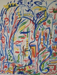 Les œuvres font  le lien avec les ancêtres et le père de l’artiste  mort récemment. L’idée la plus simple pour visualiser l’ exposition serait d’imaginer l’intérieur d’une tombe ou d’un temple égyptien antique avec toutes ses peintures et ses écrits.