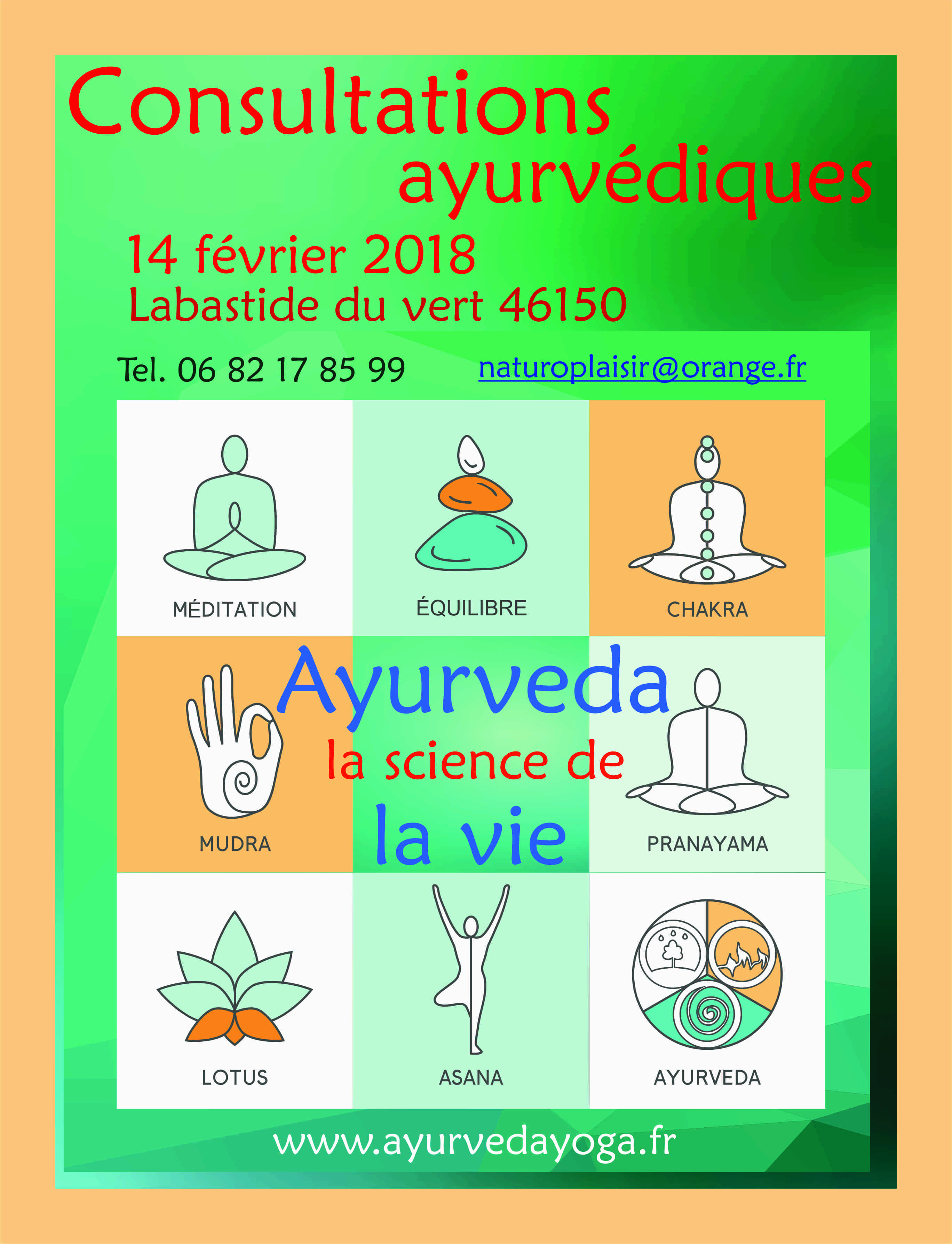 * des consultations individuelles ayurvédiques : le Dimanche 14 janvier 2017 toute la journée (sur réservation) au salon ayurvédique naturoplaisir (le bourg 46150 labastide du vert) Attention : peu de places disponibles