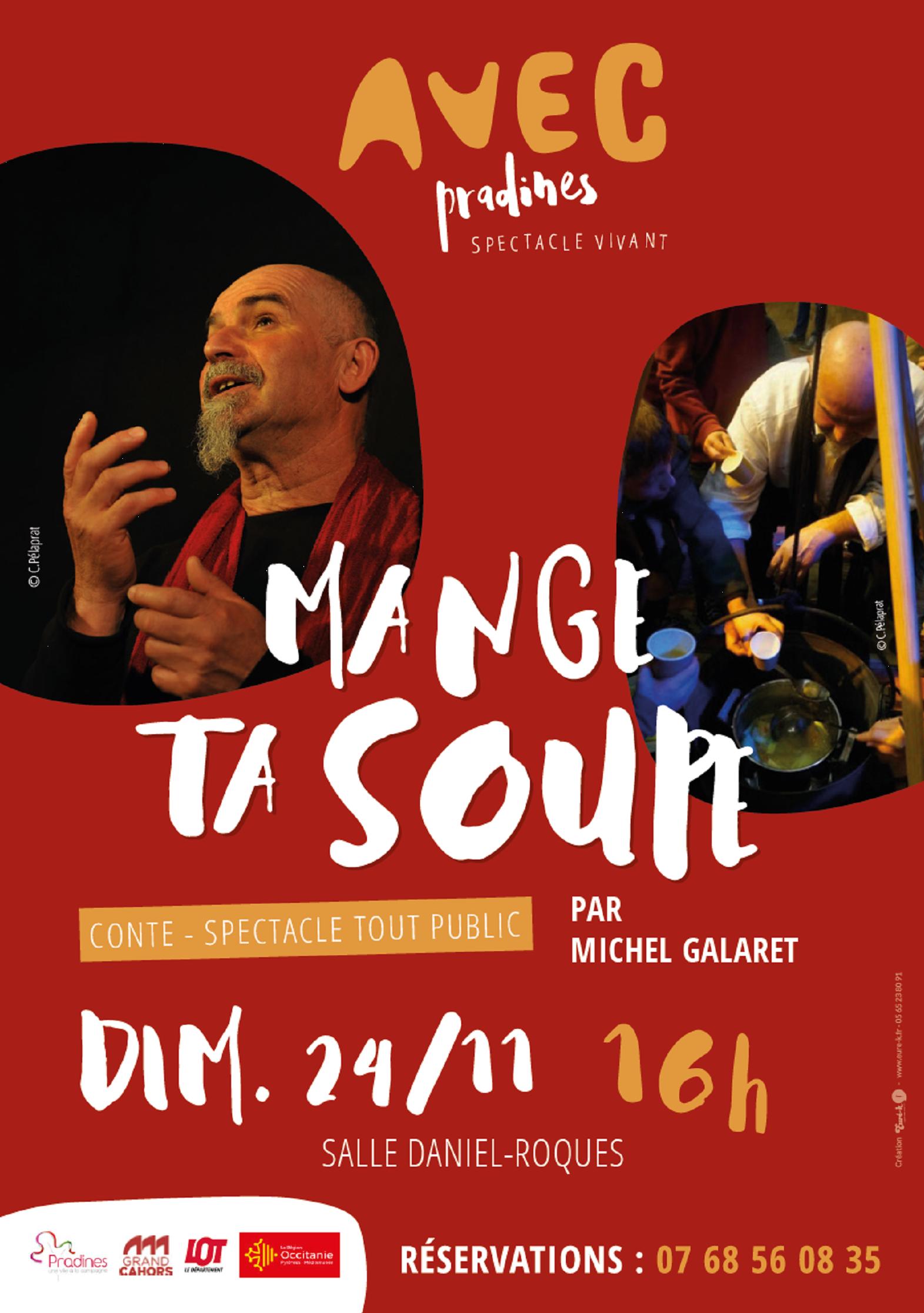 AVEC Pradines invite ce dimanche 24 novembre à 16h le conteur quercynois Michel Galaret pour un spectacle tout public : « Mange ta soupe ! ». Une belle occasion d’inviter nos enfants et petits-enfants (à partir de 6 ans) à venir se régaler d’un spectacle vivant et déguster avec les mots, les parfums et les saveurs, une vraie bonne soupe de légumes, cuite au coin du feu.