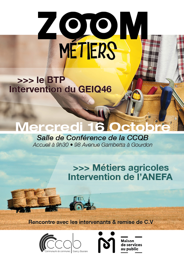 La MSAP de Gourdon organise le Mercredi 16 Octobre prochain à partir de 9h30 en salle de conférence de la CCQB, un Zoom sur les métiers du BTP (avec une intervention du GEIQ46) et sur les métiers de l’Agriculture (avec une intervention de l’ANEFA).